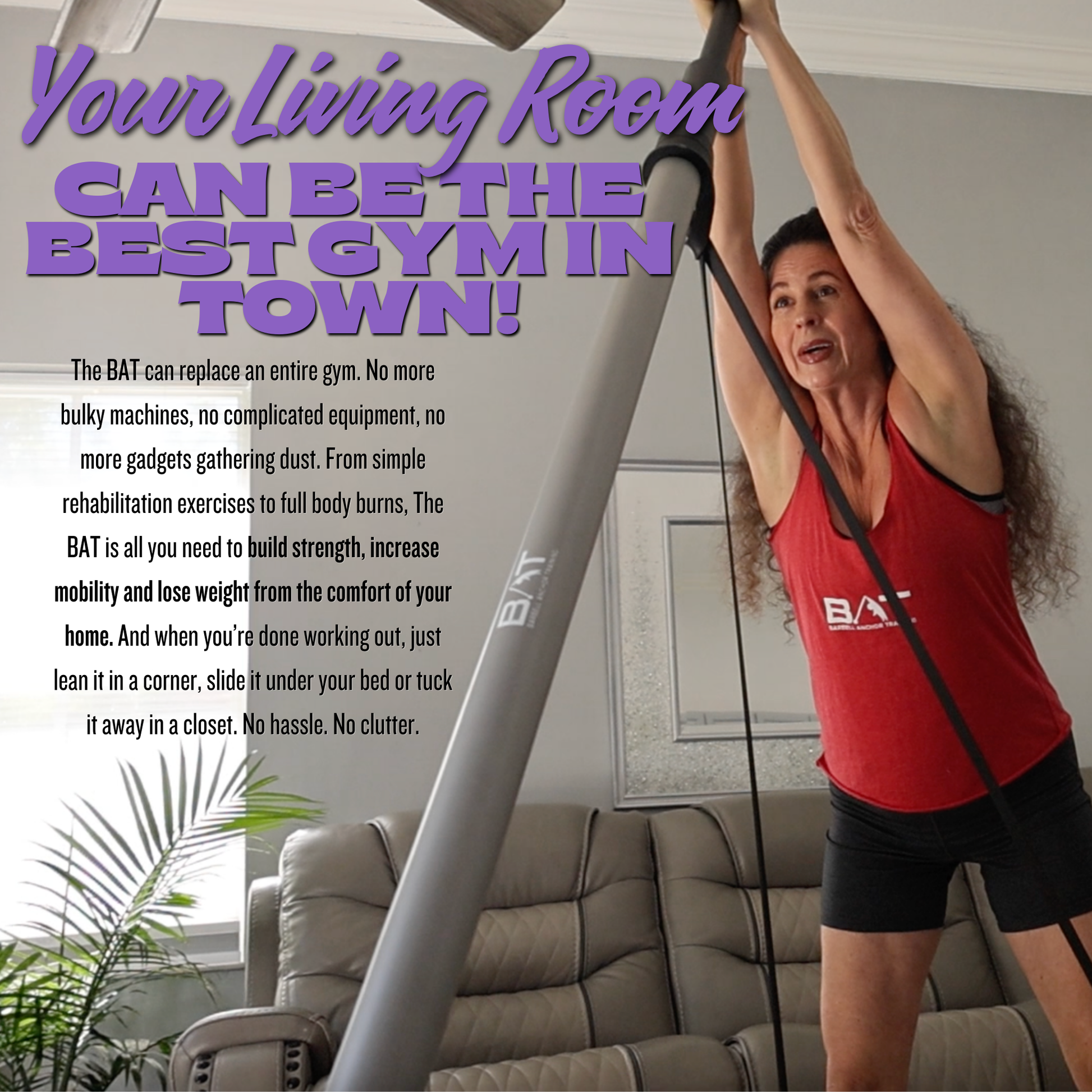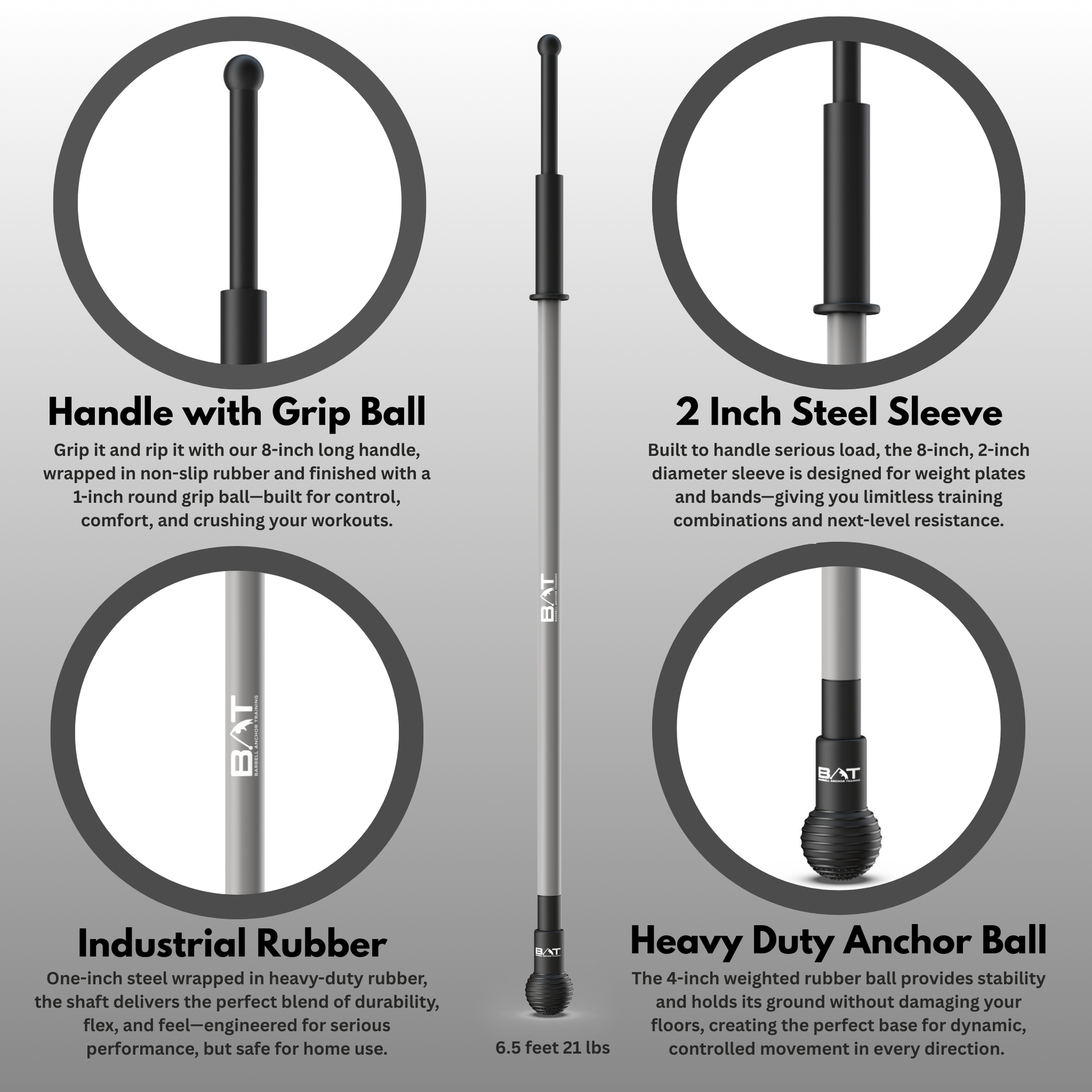 At 6.5 feet long and only 20 lbs, The BAT is crafted from solid steel and wrapped in heavy-duty rubber—rugged enough for the toughest workouts, yet safe and easy for use at home. It’s your all-in-one solution for building strength, boosting mobility, and staying healthier and more confident than ever.